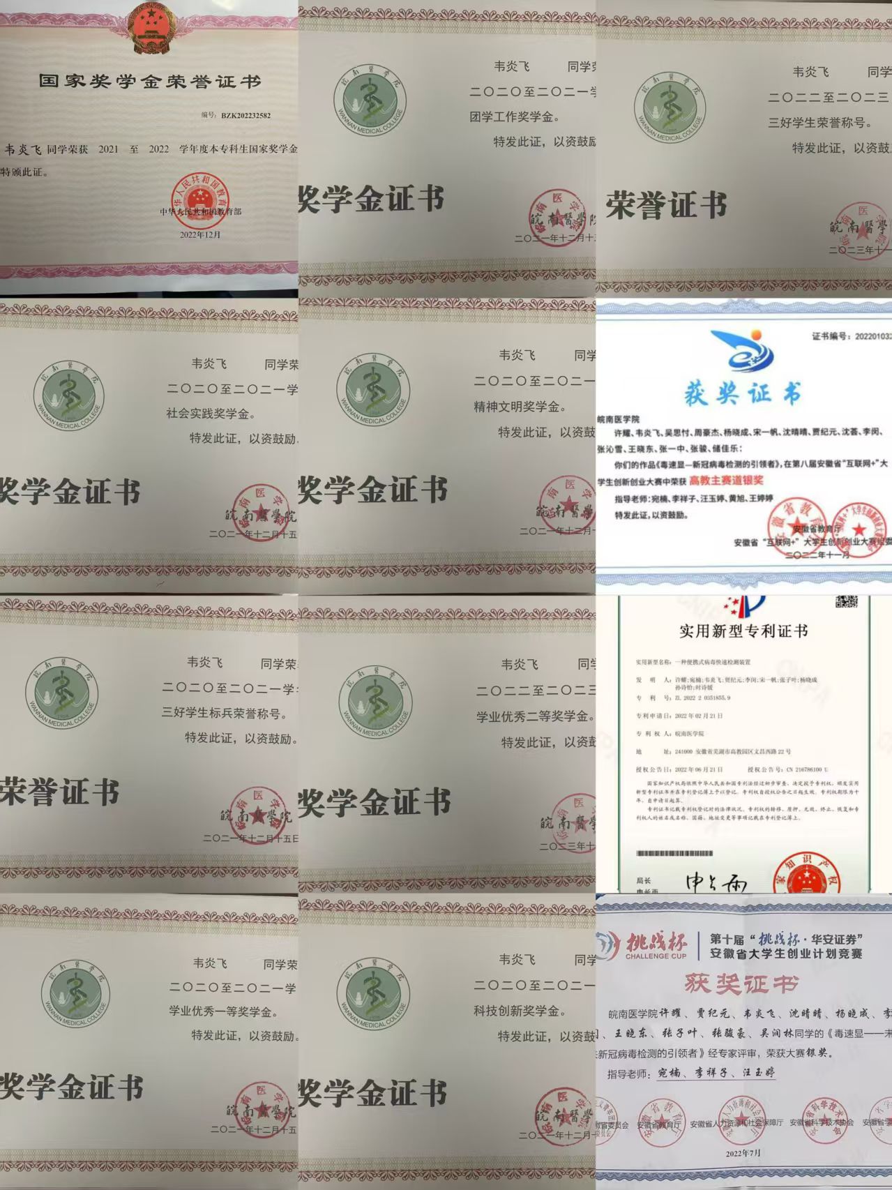 深知“健康所系,性命相托”之重,韦炎飞始终将“精勤不倦”奉为圭臬,坚信“天道酬勤,功不唐捐”。大学五年,他以近乎苛求的严谨态度对待每一门课程、每一次实验、每一份作业,在浩瀚的医学知识海洋中孜孜以求。辛勤耕耘终获硕果,大学期间,他学业成绩居年级前1%,先后获得国家奖学金、一等学业奖学金和诸多单项奖学金,这些成绩的背后是他无数日夜的辛勤付出和不懈努力。学习之余,他投身于实验室,主持一项省级大创项目,现已结题。在项目研究过程中,从选题立项到实验设计,从数据收集到结果分析,每一个环节都严谨细致,多次与指导老师沟通交流,不断优化实验方案,最终成功完成了项目研究。科研热情延伸至赛场,他凭借扎实的专业功底与敏锐的创新思维,在第八届“互联网+”大学生创新创业大赛、第十届“挑战杯”竞赛中获省赛银奖,获得一项实用新型专利。这些经历,不仅淬炼了韦炎飞的科研思维,更锻造了团队协作与解决问题的能力,为其未来在麻醉学领域的精深研究奠定了坚如磐石的根基。