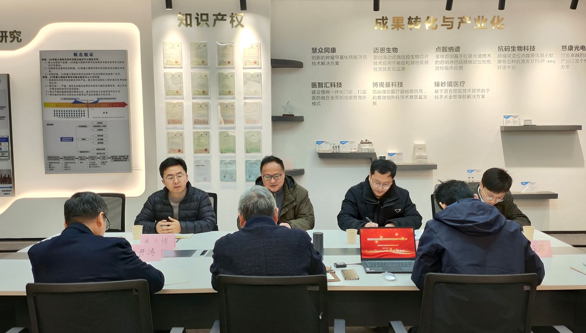 赵劲松对上海交通大学合肥肿瘤早筛创新技术研究院的热情接待表示感谢,并简要介绍了医学影像学院的学科优势、研究方向及近期取得的成果。研究院负责人古宏晨教授介绍了该院在肿瘤早期诊断技术研发方面所做的努力与取得的成绩,包括最新研发成功的多种生物标志物检测技术、创新技术成果落地转化等,表示这些科技成果不仅提高了癌症早期发现率,同时也为患者提供了更加个性化、高效的治疗方案选择。