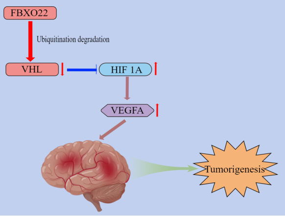 F-box protein 22(FBXO22)是一种E3泛素连接酶,负责招募和结合F-box蛋白家族底物的成员,参与多种人类恶性肿瘤的发生、发展、复发和转移。据报道,FBXO22可以通过介导KLF4、KDM4A和HDM2的降解来调控多种癌症的恶性进展。然而,FBXO22是否影响胶质母细胞瘤的进展并不清晰。在本研究中,研究人员发现,FBXO22在胶质瘤中高表达,并与更严重的病理特征和GBM患者较短的生存期呈正相关。研究人员揭示了FBXO22促进GBM细胞增殖、血管生成、迁移侵袭和肿瘤发生。机制上,研究人员发现FBXO22通过直接介导VHL泛素化降解来降低VHL表达,从而增加HIF-1α和VEGFA的表达。此外,实验数据证实在胶质瘤患者中,FBXO22、HIF-1α和VEGFA表达之间存在正相关,而FBXO22与VHL蛋白表达之间存在负相关。该研究预示着FBXO22是神经胶质瘤患者有前景的诊断标志物和治疗靶点。