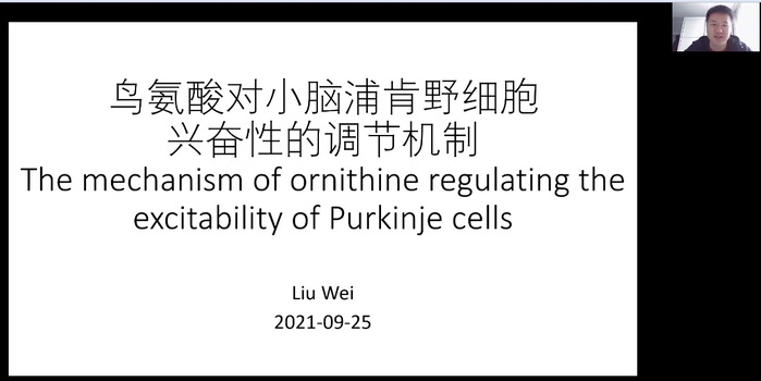 会议第四个议程,报告会特邀2010年“启明星”小组成员、北京大学刘伟博士作“鸟氨酸对小脑浦肯野细胞兴奋性的调节机制”的学术报告。此报告是“启明星”小组成员系列报告的首场报告,得到了大家的热烈欢迎,特别是让在校“启明星”小组成员受益匪浅。