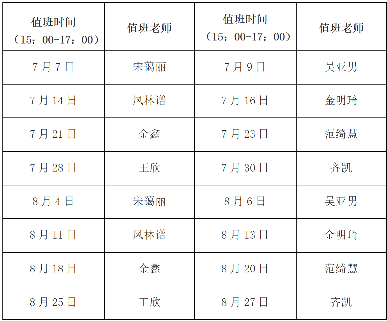1.值班时间:2025年7月7日-8月31日期间的每周一、周三15:00-17:00(详见附件)。